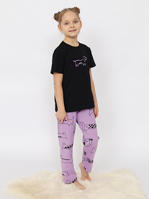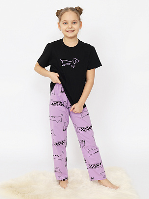 Комбинированная пижама из футболки и брюк. Футболка гладкокрашенная, свободного покроя с коротким рукавом. Горловина обработана притачной бейкой из рибаны с лайкрой. Перед оформлен небольшим принтом. Прямые брюки умеренного объёма выполнены из набивного полотна дополнительного цвета. Цельнокроенный пояс обработан плоским швом вподгибку с одновременным прокладыванием резинки.