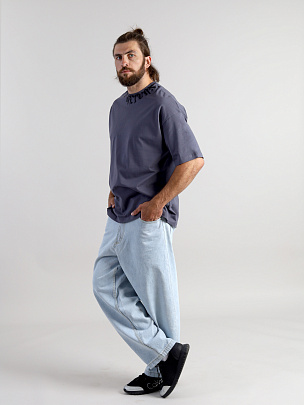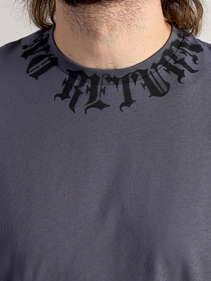 Объемная футболка оверсайз из кулирки повышенной плотности длиной до бедер. Рукав до локтя. Круглая горловина обработана узкой притачной обтачкой из рибаны с эластаном. Горловина декорирована принтом "возврата нет".