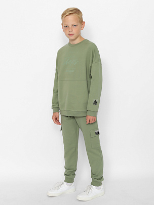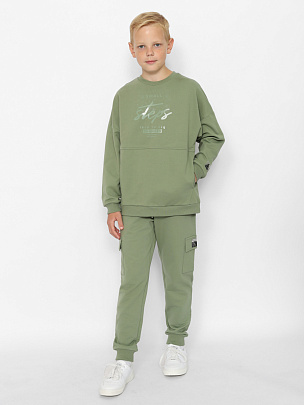 Джемпер для мальчика свободного силуэта с карманом спереди и притачным эластичным поясом по низу. Горловина круглая, обработана притачным воротником из полотна с эластаном. Рукава длинные с эластичными манжетами по низу. Перед джемпера декорирован принтом "Маленькие шаги приводят к большим переменам".
