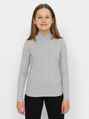 Джемпер для девочки с короткими рукавами, свободного силуэта, спущенным плечом и отложным воротником. Сзади застежка на пуговицу. Спереди декорирован металлическим лейблом.