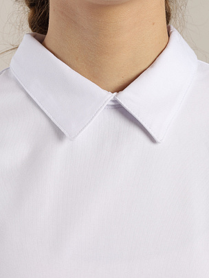 Джемпер для девочки с длинными рукавами и отложным воротником из кулирки, свободного силуэта. Рукава объемные, со спущенным плечом, снизу манжет из кулирки. Спинка с вырезом-капелькой и застёжкой на пуговицу-бусину с петлёй.