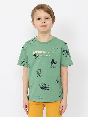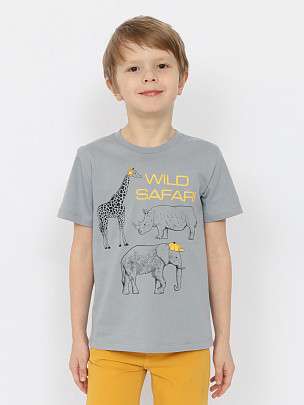Футболка с коротким рукавом. Горловина круглая, обработана узким воротником из полотна с эластаном. Перед оформлен шрифтовым принтом.